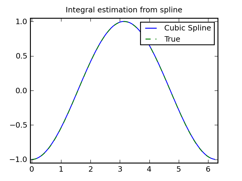 >>> yder = interpolate.splev(xnew,tck,der=1) >>> plt.figure() >>> plt.plot(xnew,yder,xnew,np.cos(xnew),'--') >>> plt.legend(['Cubic Spline', 'True']) >>> plt.axis([-0.05,6.33,-1.05,1.05]) >>> plt.title('Derivative estimation from spline') >>> plt.show()Integral of spline