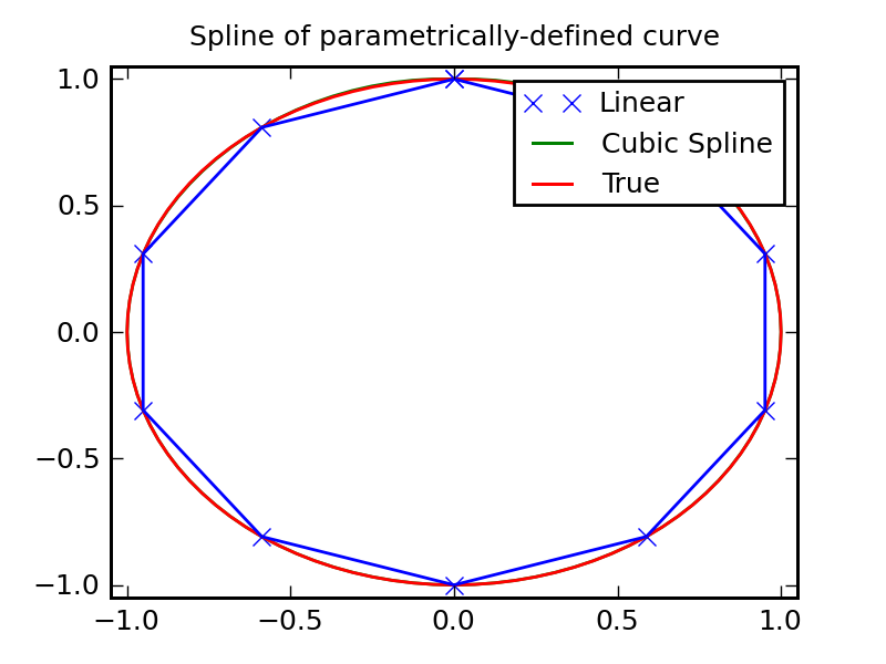 >>> t = np.arange(0,1.1,.1) >>> x = np.sin(2*np.pi*t) >>> y = np.cos(2*np.pi*t) >>> tck,u = interpolate.splprep([x,y],s=0) >>> unew = np.arange(0,1.01,0.01) >>> out = interpolate.splev(unew,tck) >>> plt.figure() >>> plt.plot(x,y,'x',out[0],out[1],np.sin(2*np.pi*unew),np.cos(2*np.pi*unew),x,y,'b') >>> plt.legend(['Linear','Cubic Spline', 'True']) >>> plt.axis([-1.05,1.05,-1.05,1.05]) >>> plt.title('Spline of parametrically-defined curve') >>> plt.show()