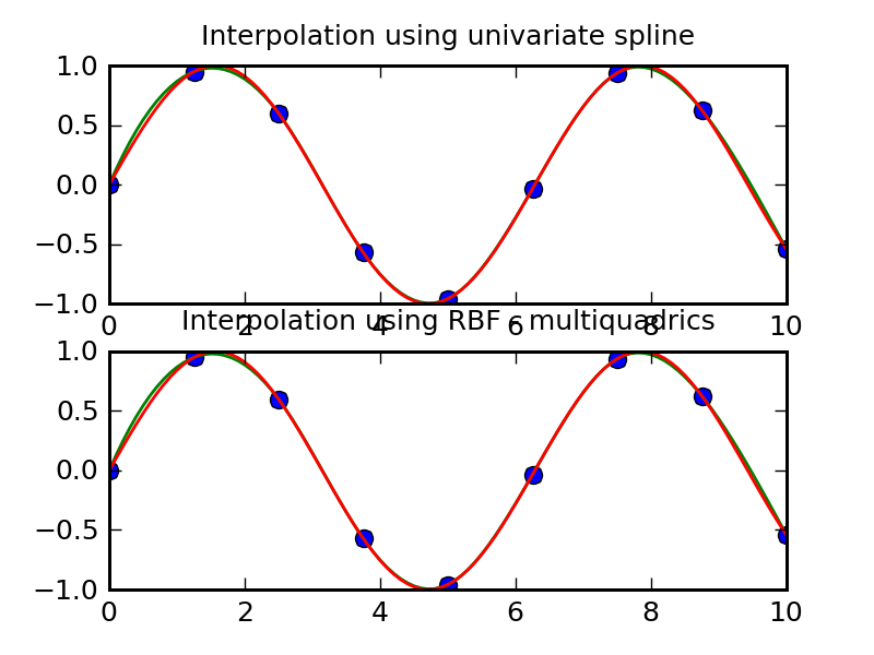 >>> import numpy as np >>> from scipy.interpolate import Rbf, InterpolatedUnivariateSpline >>> import matplotlib.pyplot as plt>>> # setup data >>> x = np.linspace(0, 10, 9) >>> y = np.sin(x) >>> xi = np.linspace(0, 10, 101)>>> # use fitpack2 method >>> ius = InterpolatedUnivariateSpline(x, y) >>> yi = ius(xi)>>> plt.subplot(2, 1, 1) >>> plt.plot(x, y, 'bo') >>> plt.plot(xi, yi, 'g') >>> plt.plot(xi, np.sin(xi), 'r') >>> plt.title('Interpolation using univariate spline')>>> # use RBF method >>> rbf = Rbf(x, y) >>> fi = rbf(xi)>>> plt.subplot(2, 1, 2) >>> plt.plot(x, y, 'bo') >>> plt.plot(xi, yi, 'g') >>> plt.plot(xi, np.sin(xi), 'r') >>> plt.title('Interpolation using RBF - multiquadrics') >>> plt.show()